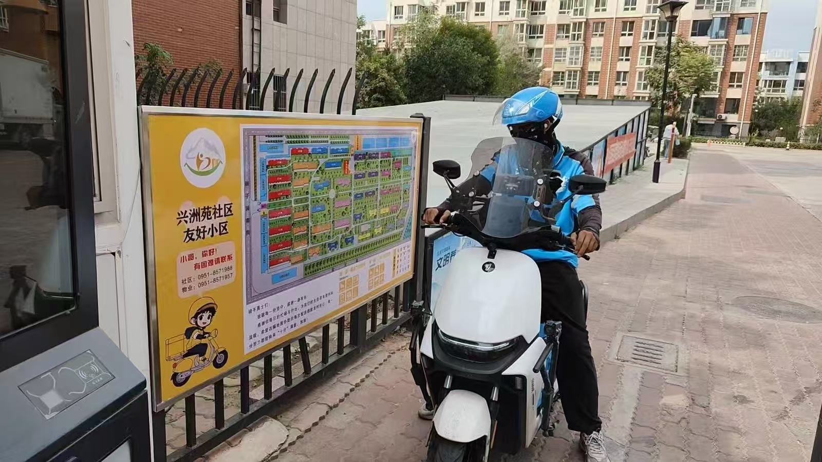 4月13日中午,银川市西夏区物华兴洲苑小区门前,外卖骑手韩正亮将电动自行车停到专属车位,对照着门口的骑手友好地图,快步奔向目标楼栋。“以前送餐找楼难,如今小区门口安装了导引地图,每单都能省下几分钟。”韩正亮说。