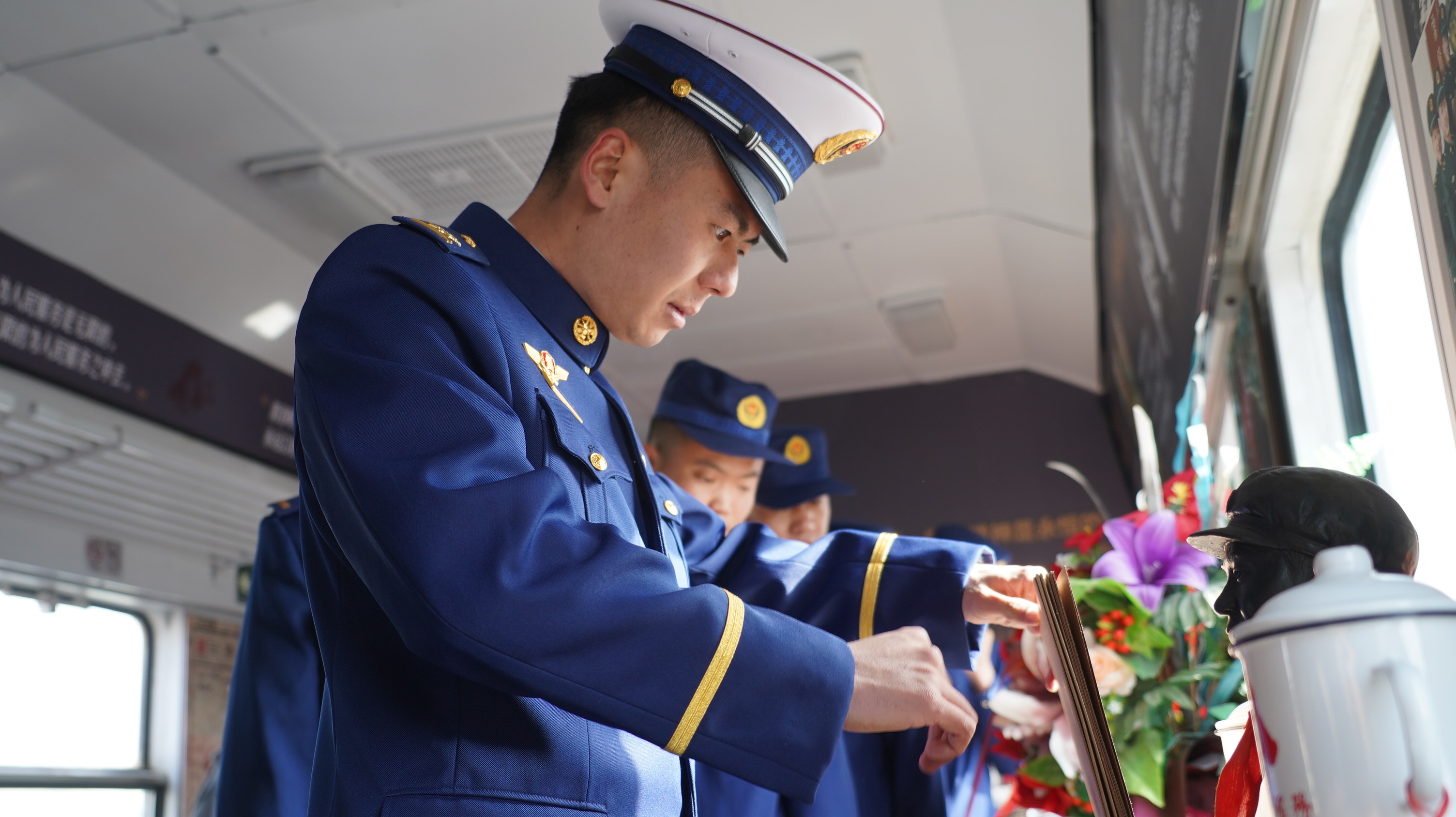 消防员参观雷锋生平纪事馆。