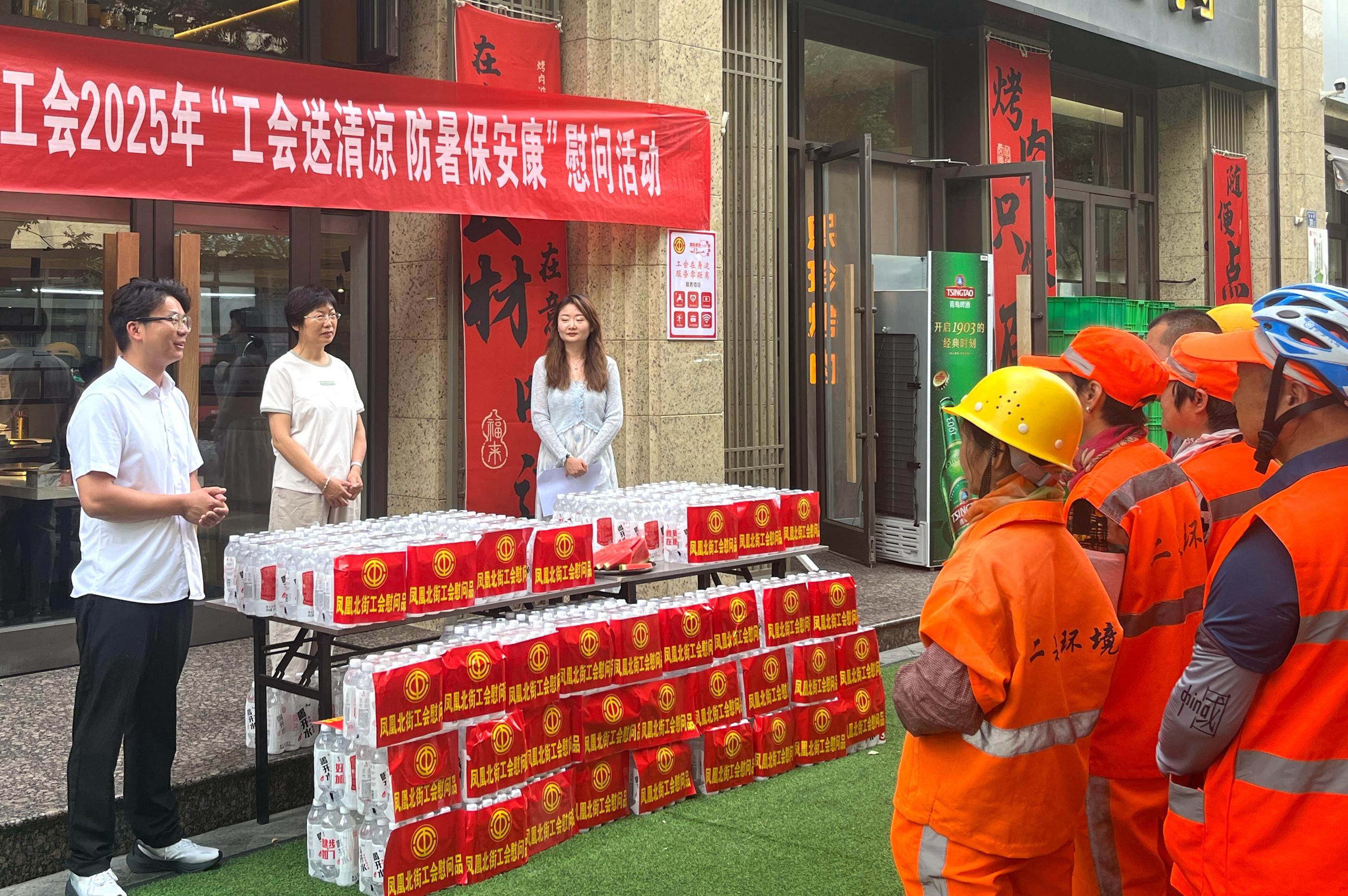 为户外工作者发放矿泉水和饮料。