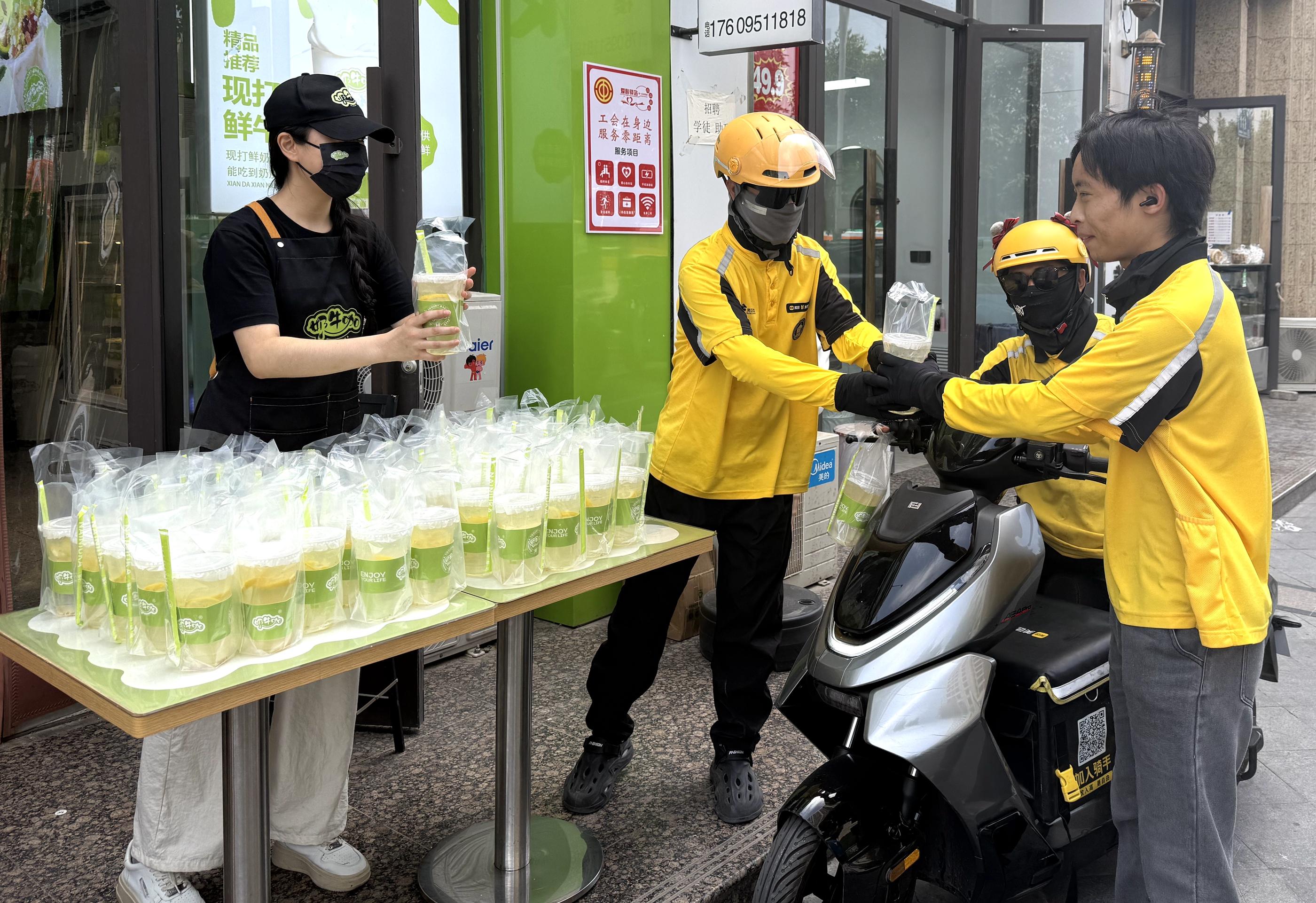 凤凰北街爱心商户“牛奶咖”工会“微驿站”为外卖员准备了免费的柠檬水。“柠檬水清凉消暑,非常解渴,我们给工会和商家点个赞。”外卖小哥张文勇高兴地说。