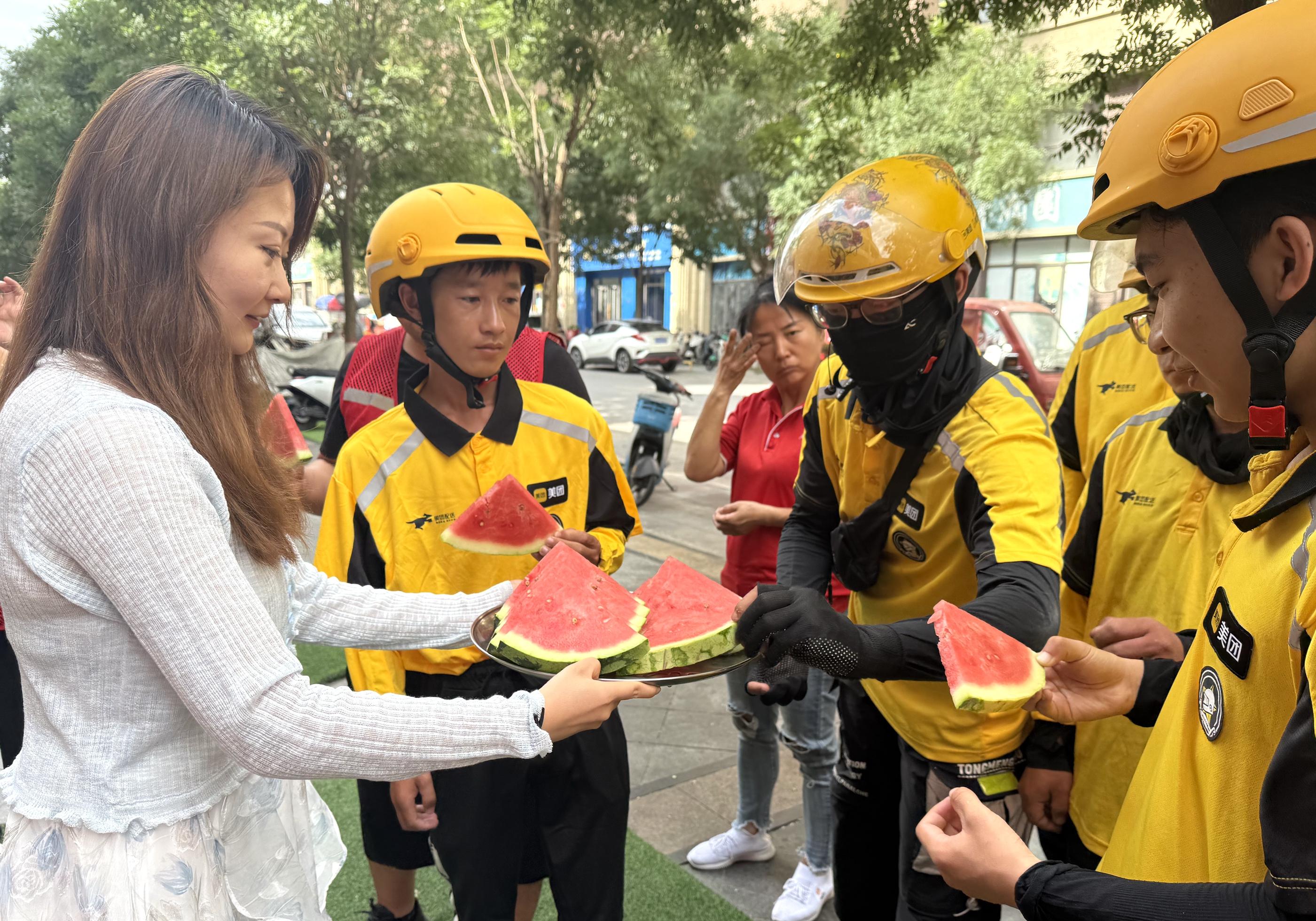 为外卖骑手送上清凉西瓜。