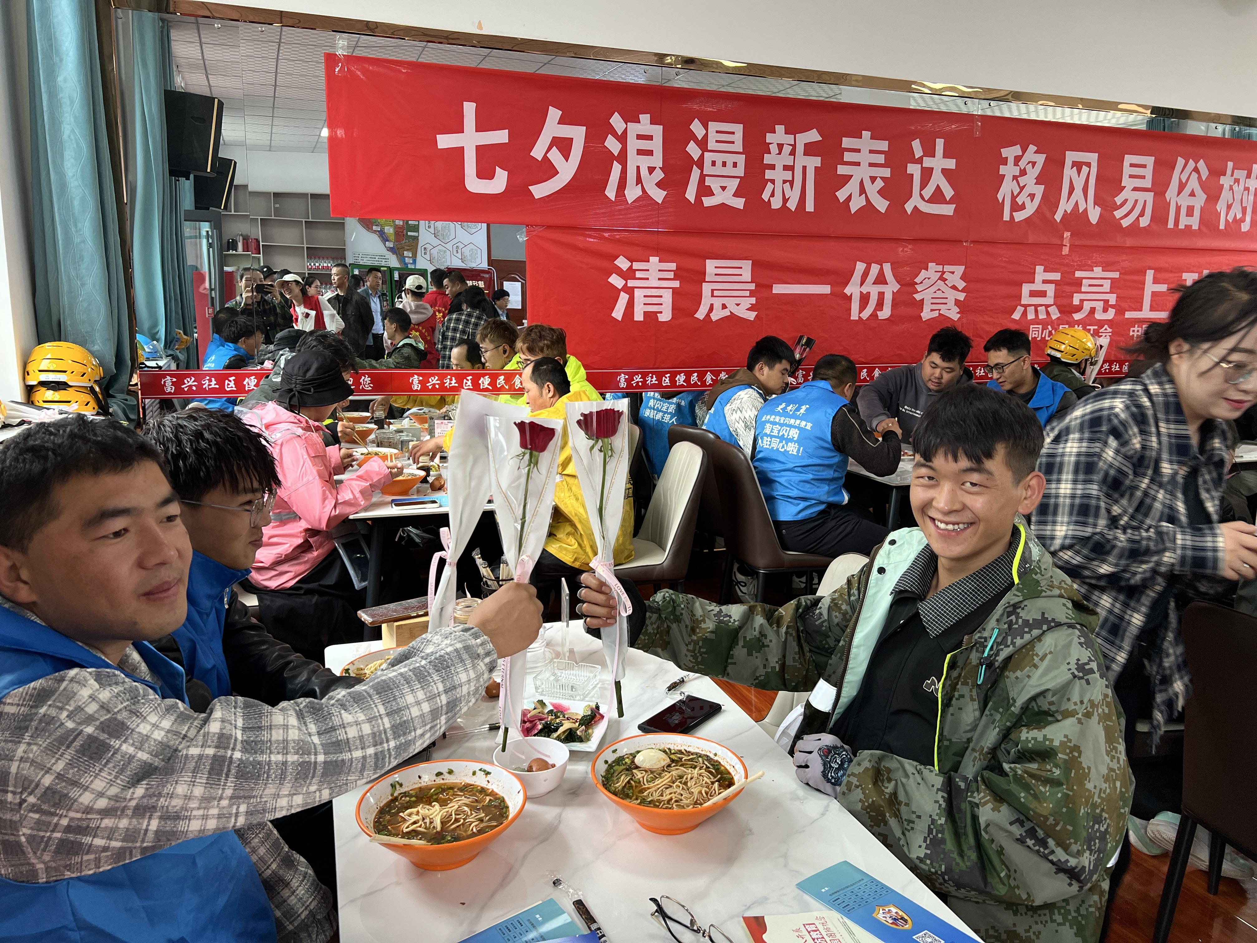 “前几天听大家说七夕想送花又嫌贵,送了也没时间陪家人,我们就想了‘拉面配玫瑰’这个主意。”富兴社区党总支书记丁玉琴说道,“面暖肚子,花暖人心,钱不多,但心意是实的。”